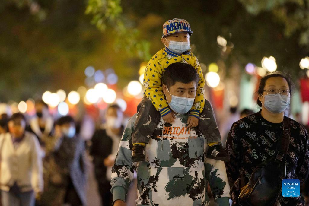 Citizens follow COVID-19 prevention and control rules as they visit the Central Street in Harbin, northeast China's Heilongjiang Province, Oct. 2, 2021. Strict epidemic prevention and control measures have been imposed at the city's main shopping malls, tourist attractions and other sites where mass gatherings take place during the ongoing National Day holiday. Many essential workers stick to their posts to conduct temperature checks, health code checks, and disinfection. (Xinhua/Zhang Tao)
