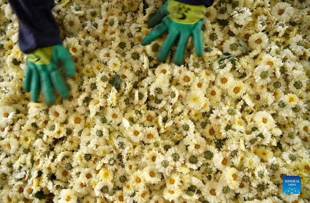 A farmer processes chrysanthemums in Lingsha Township of Pingluo County, Shizuishan, northwest China's Ningxia Hui Autonomous Region, Sept. 30, 2021. Farmers are busy in harvesting chrysanthemums recently in Lingsha Township. Local authorities have introduced traditional Chinese medicine manufacturers to promote the development of chrysanthemums industry with integration of planting, processing and sales. (Xinhua/Wang Peng)