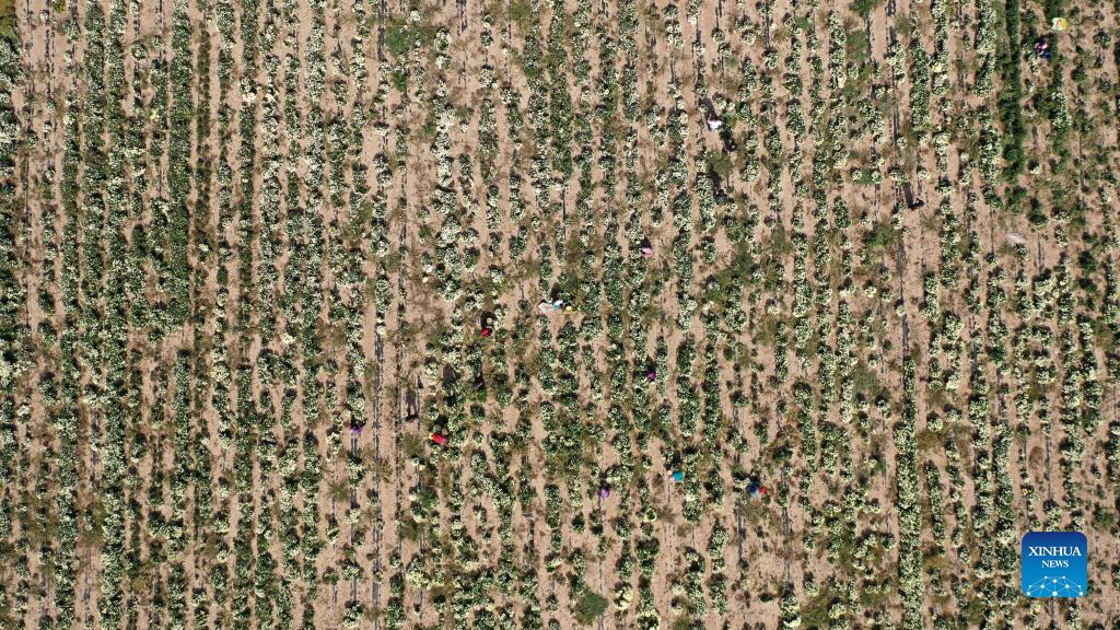 Aerial photo taken on Sept. 30, 2021 shows farmers picking chrysanthemums in Lingsha Township of Pingluo County, Shizuishan, northwest China's Ningxia Hui Autonomous Region. Farmers are busy in harvesting chrysanthemums recently in Lingsha Township. Local authorities have introduced traditional Chinese medicine manufacturers to promote the development of chrysanthemums industry with integration of planting, processing and sales. (Xinhua/Wang Peng)
