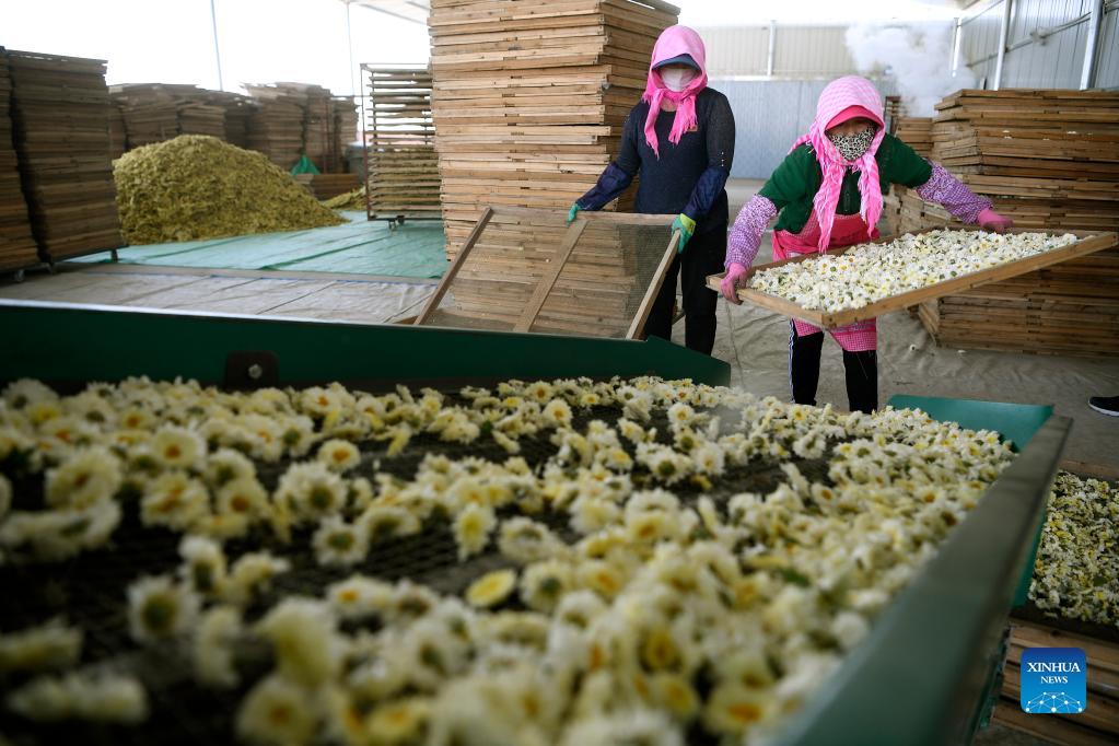 Farmers process chrysanthemums in Lingsha Township of Pingluo County, Shizuishan, northwest China's Ningxia Hui Autonomous Region, Sept. 30, 2021. Farmers are busy in harvesting chrysanthemums recently in Lingsha Township. Local authorities have introduced traditional Chinese medicine manufacturers to promote the development of chrysanthemums industry with integration of planting, processing and sales. (Xinhua/Wang Peng)