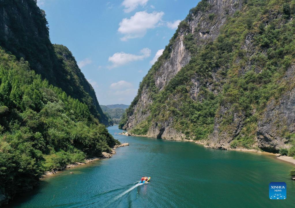 Aerial photo shows tourists enjoying a raft ride at the Maoyan River scenic area during the ongoing National Day holiday in Zhangjiajie, central China's Hunan Province, Oct. 3, 2021. (Photo by Wu Yongbing/Xinhua)