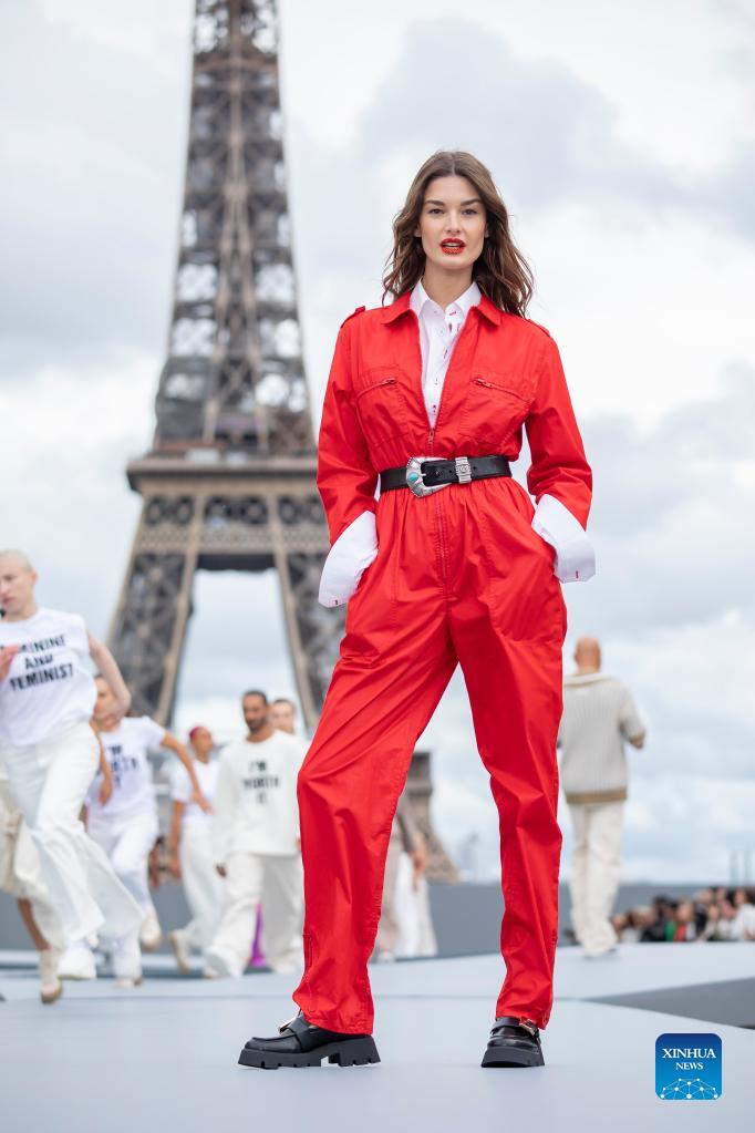 A model presents a creation for L'Oreal on the sidelines of the Paris Fashion Week Spring-Summer 2022 Ready-to-Wear collection shows at the Trocadero in Paris, France, on Oct. 3, 2021. (Xinhua)