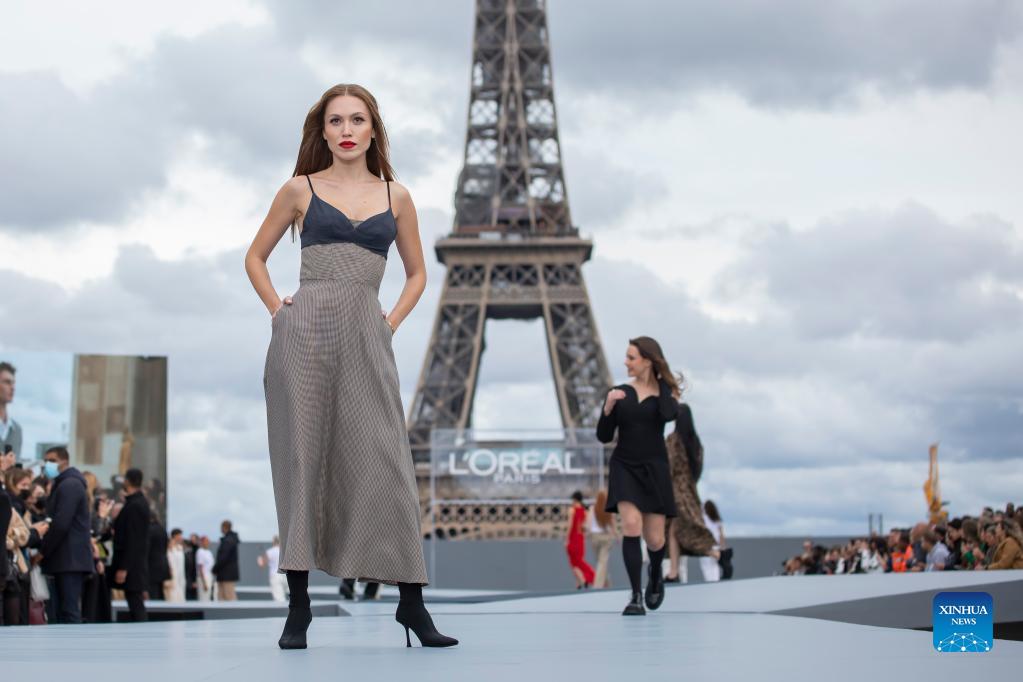 A model presents a creation for L'Oreal on the sidelines of the Paris Fashion Week Spring-Summer 2022 Ready-to-Wear collection shows at the Trocadero in Paris, France, on Oct. 3, 2021. (Xinhua)