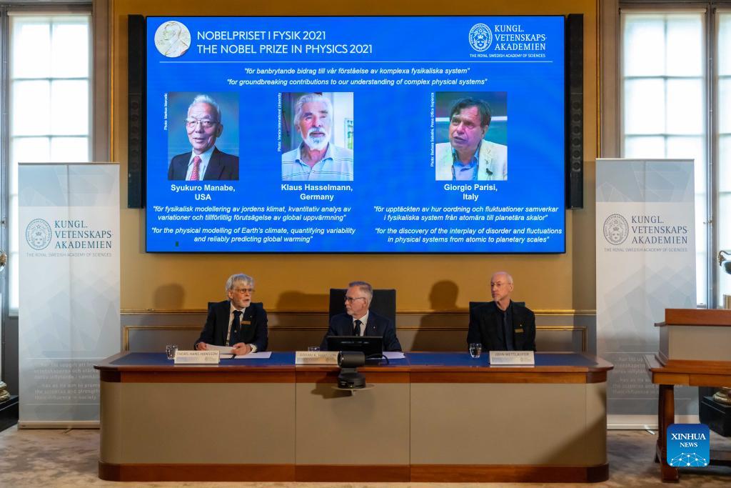 Portraits of the 2021 Nobel laureates in Physics Syukuro Manabe (L), Klaus Hasselmann (C) and Giorgio Parisi are seen on a screen during the prize announcement in Stockholm, Sweden, Oct. 5, 2021. The 2021 Nobel Prize in Physics is shared by three scientists, the Royal Swedish Academy of Sciences announced on Tuesday. The Royal Swedish Academy of Sciences has decided to award the Nobel Prize in Physics 2021 "for groundbreaking contributions to our understanding of complex physical systems," with one half jointly to Syukuro Manabe and Klaus Hasselmann "for the physical modelling of Earth's climate, quantifying variability and reliably predicting global warming," and the other half to Giorgio Parisi "for the discovery of the interplay of disorder and fluctuations in physical systems from atomic to planetary scales." (Photo by Wei Xuechao/Xinhua)