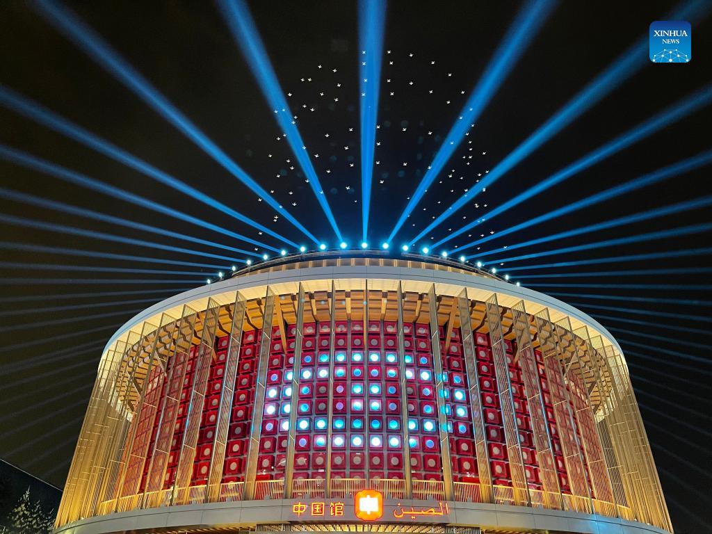 Photo taken on Oct. 4, 2021 shows the light show at the China Pavilion of Expo 2020 Dubai in Dubai, the United Arab Emirates. Covering an area of 4,636 square meters, the China Pavilion is one of the largest at the expo. Featuring a lantern-shaped design, the pavilion is called "The Light of China," symbolizing hope and a bright future. (Xinhua/Su Xiaopo)