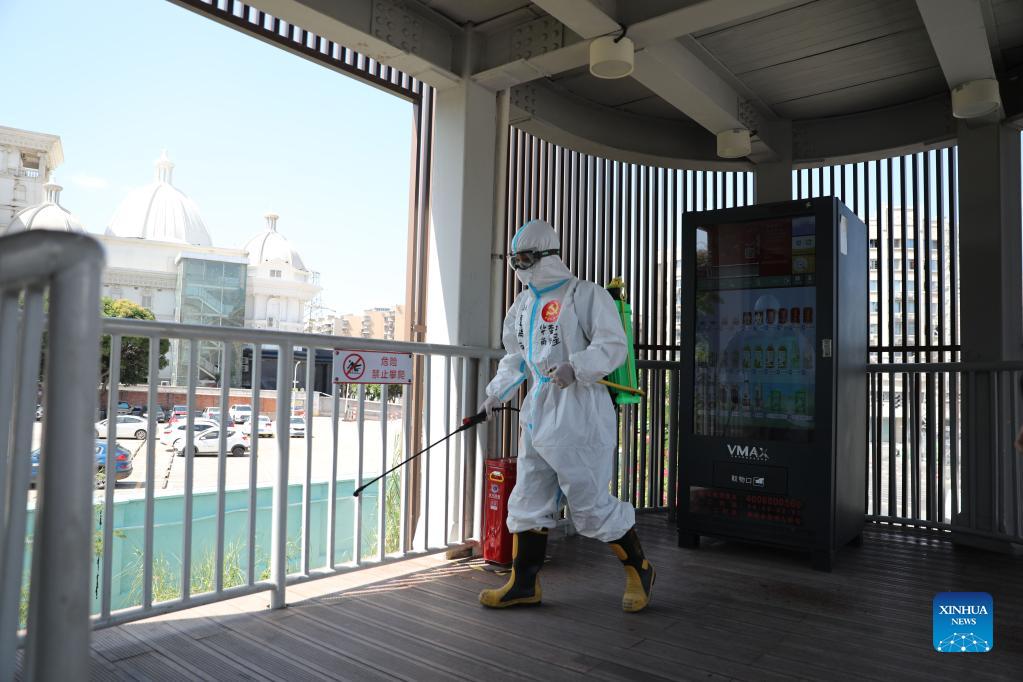 A fireman disinfects the entrance of a skywalk in Xiamen, southeast China's Fujian Province, Oct. 5, 2021. Outdoor public places in Xiamen started to reopen from Oct. 5, as the results of the sixth round of citywide nucleic acid testing all came out negative. (Photo by Zeng Demeng/Xinhua)
