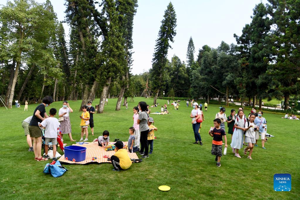 People have fun at the Xiamen Botanical Garden in Xiamen, southeast China's Fujian Province, Oct. 5, 2021. Outdoor public places in Xiamen started to reopen from Oct. 5, as the results of the sixth round of citywide nucleic acid testing all came out negative. (Xinhua/Jiang Kehong)
