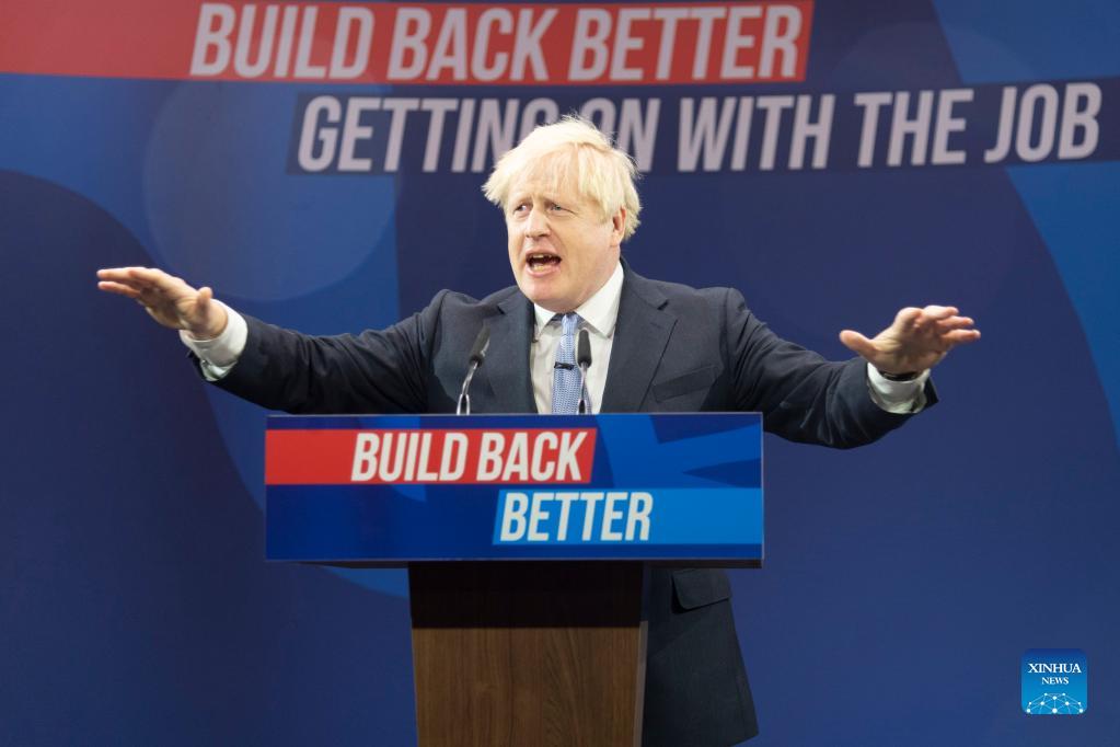 British Prime Minister Boris Johnson makes a speech at the Conservative Party's annual conference in Manchester, Britain, on Oct. 6, 2021. Johnson on Wednesday vowed to change the direction of the British economy, shifting away from its reliance on cheap imported labor, as he shrugged off the ongoing fuel, food and industry crises as "merely a function of growth and economic revival." (Photo by Ray Tang/Xinhua)