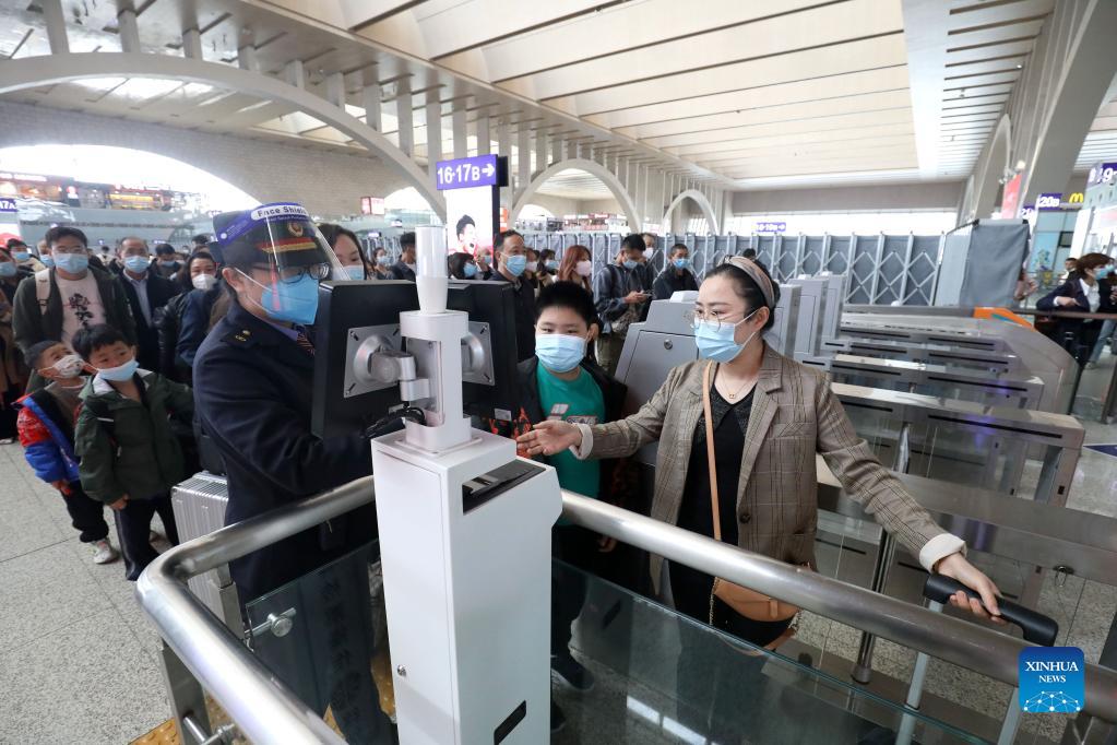 Passengers check in at the Shijiazhuang railway station in Shijiazhuang, north China's Hebei Province, Oct. 7, 2021. Transportation hubs across China are witnessing the peak of return passengers as the week-long holiday draws to an end on Thursday. (Photo by Liang Zidong/Xinhua)