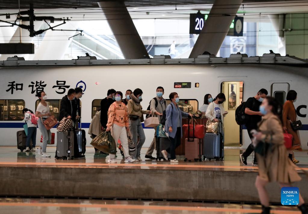 Passengers wait to board the train at the Wuhan railway station in Wuhan, central China's Hubei Province, Oct. 7, 2021. Transportation hubs across China are witnessing the peak of return passengers as the week-long holiday draws to an end on Thursday. (Photo by Zhao Jun/Xinhua)