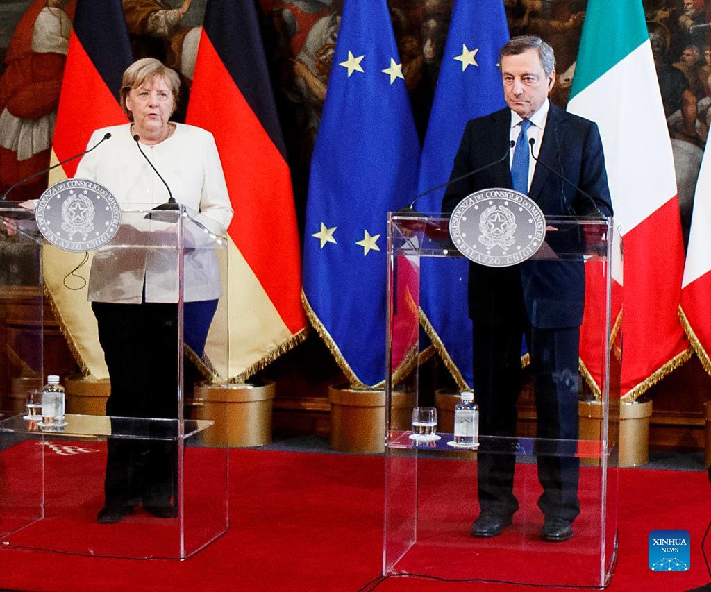 Italian Prime Minister Mario Draghi (R) and visiting German Chancellor Angela Merkel attend a joint press conference in Rome, Italy, on Oct. 7, 2021. Italian Prime Minister Mario Draghi on Thursday thanked outgoing German Chancellor Angela Merkel for playing a "decisive role" in shaping the future of the European Union (EU). (Str/Xinhua)