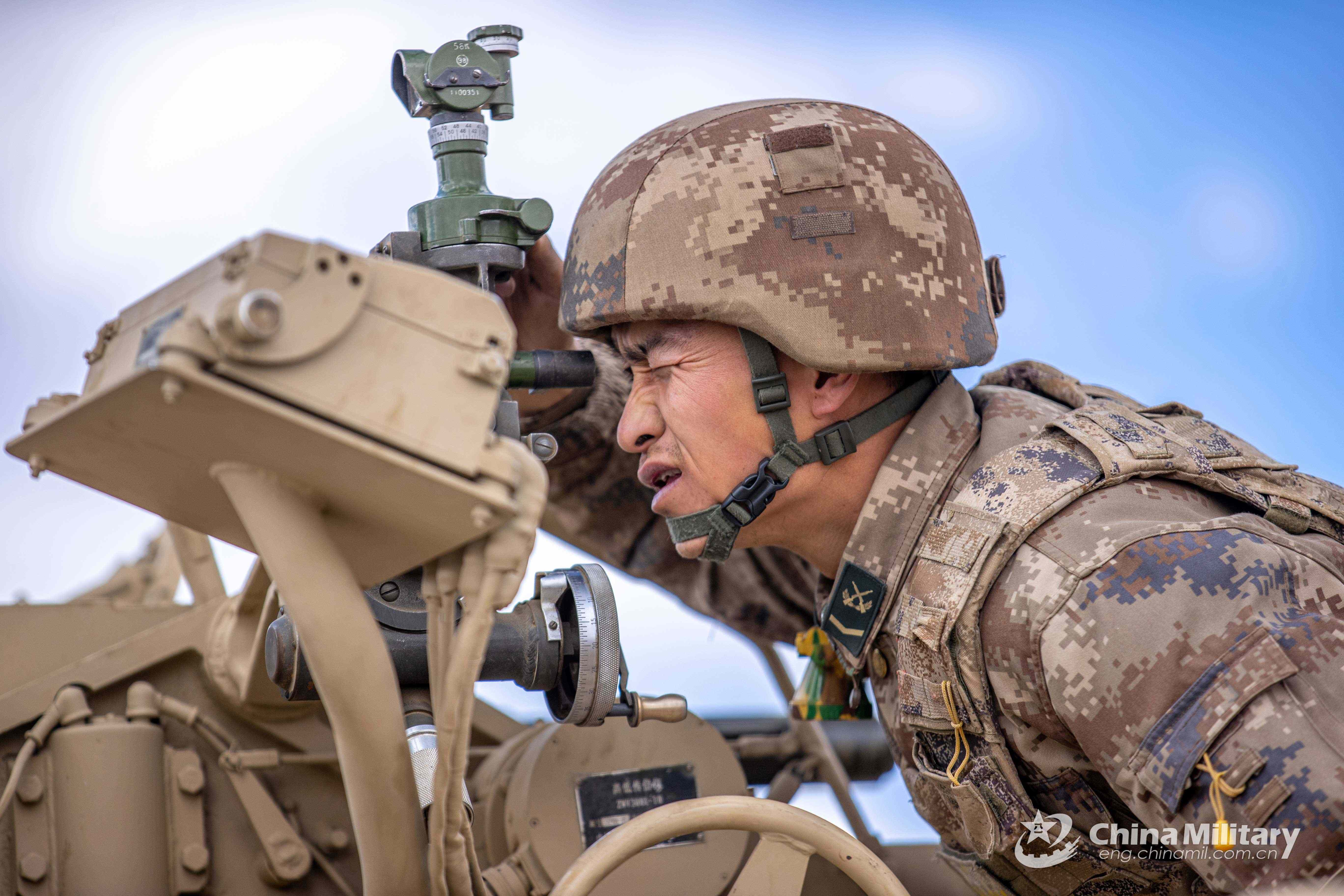 An artilleryman assigned to a combined-arms regiment under the PLA Xinjiang Military Command uses an optical device to take sight and be ready for shelling the targets during a live-fire training exercise in mid September, 2021. (eng.chinamil.com.cn/Photo by Zhou Kaiwei)