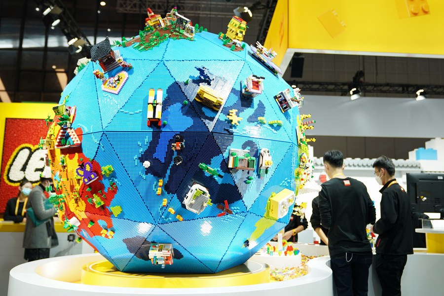 The booth of Danish toy giant LEGO Group is seen at the Consumer Goods exhibition area during the third China International Import Expo (CIIE) in Shanghai, east China, Nov. 5, 2020. (Xinhua/Ding Ting)