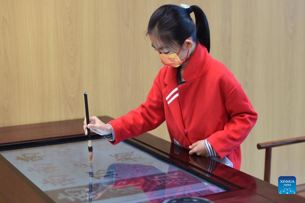 A girl practices Chinese calligraphy on an electronic device at the Shijiazhuang Library in Shijiazhuang, capital of north China's Hebei Province, Oct. 6, 2021. The library hosted a series of cultural events to better entertain visitors during the week-long National Day holiday starting from Oct. 1. (Xinhua/Luo Xuefeng)