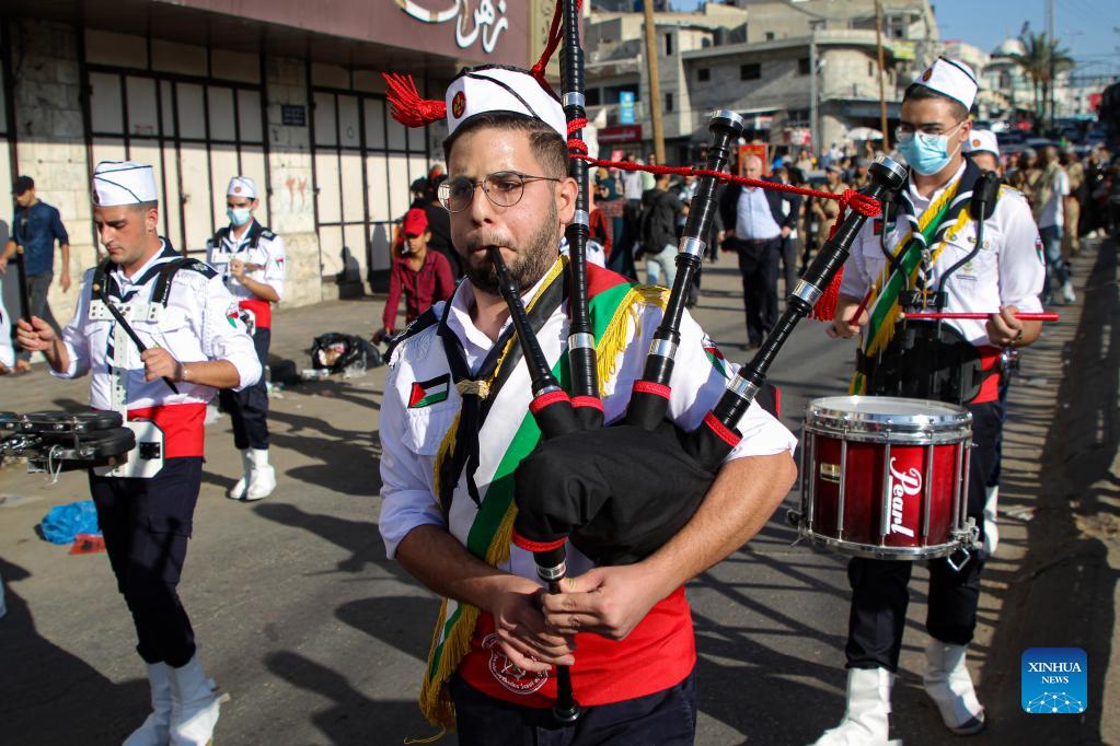 Palestinian scouts march during an event in celebration of Palestinian Heritage Day in Gaza City, on Oct. 7, 2021. (Photo by Rizek Abdeljawad/Xinhua)