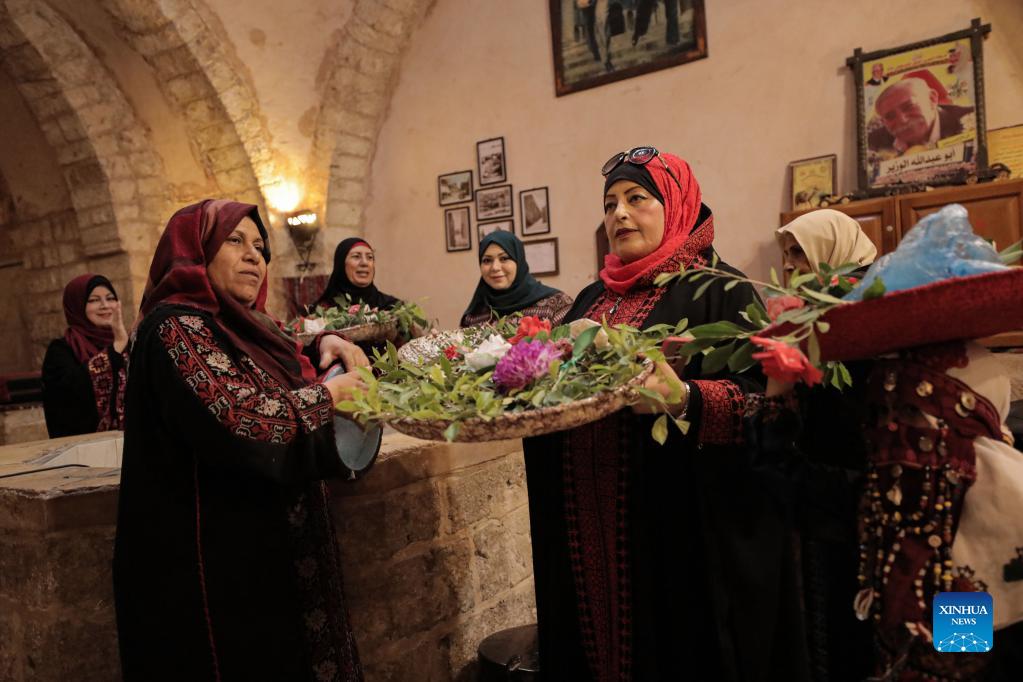 Palestinians participate in an event simulating a traditional Palestinian wedding in celebration of Palestinian Heritage Day in Gaza City, on Oct. 7, 2021. (Photo by Rizek Abdeljawad/Xinhua)