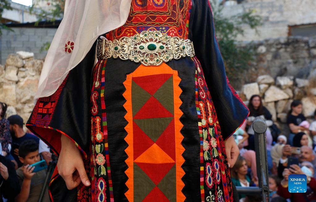 A Palestinian model presents a traditional Palestinian dress during a fashion show in celebration of Palestinian Heritage Day at Sebastia Village, north of the West Bank city of Nablus, on Oct. 7, 2021. (Photo by Ayman Nobani/Xinhua)
