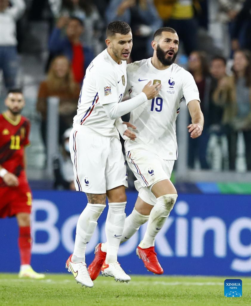 France's Karim Benzema (R) celebrates with his teammate Lucas Hernandez during the UEFA Nations League semifinal between Belgium and France in Turin, Italy, Oct. 7, 2021. (Str/Xinhua)