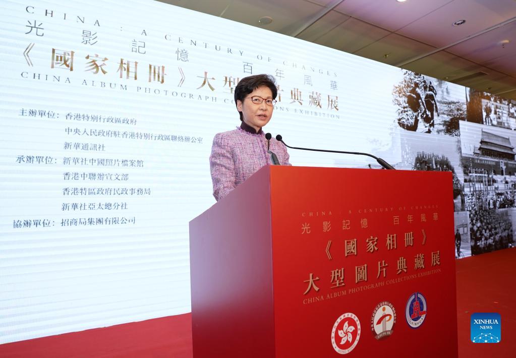 Chief Executive of China's Hong Kong Special Administrative Region (HKSAR) Carrie Lam addresses the opening ceremony of a photo exhibition at Hong Kong Central Library in Hong Kong, south China, Oct. 8, 2021. A photo exhibition that opened Friday in Hong Kong showcased the unfading blood ties between Hong Kong and the motherland over the past 100 years, as well as the great achievements of China.(Xinhua/Wang Shen)