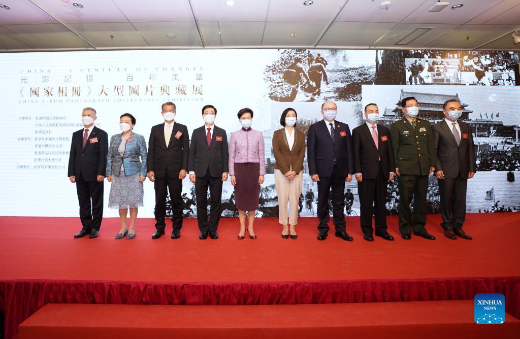 Guests pose for a group photo during the opening ceremony of a photo exhibition at Hong Kong Central Library in Hong Kong, south China, Oct. 8, 2021. A photo exhibition that opened Friday in Hong Kong showcased the unfading blood ties between Hong Kong and the motherland over the past 100 years, as well as the great achievements of China.(Xinhua/Wang Shen)