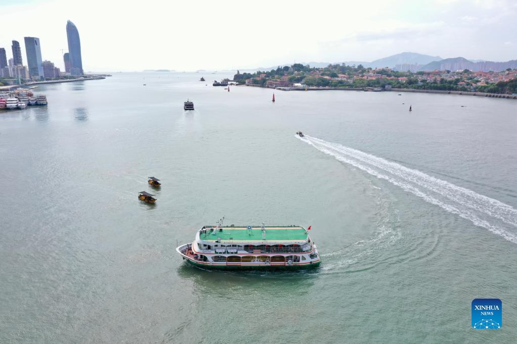 Aerial photo taken on Oct. 8, 2021 shows ships and ferries sailing on the sea near Gulangyu island in Xiamen City, southeast China's Fujian Province. The city of Xiamen in southeast China's Fujian Province, which witnessed the country's latest resurgence of COVID-19 cluster infections, cleared all medium- and high-risk areas for COVID-19 on Thursday night. The city downgraded three medium-risk areas and one high-risk area for COVID-19 to low-risk areas starting 9 p.m. Thursday, according to the municipal epidemic prevention and control headquarters. (Xinhua/Jiang Kehong)