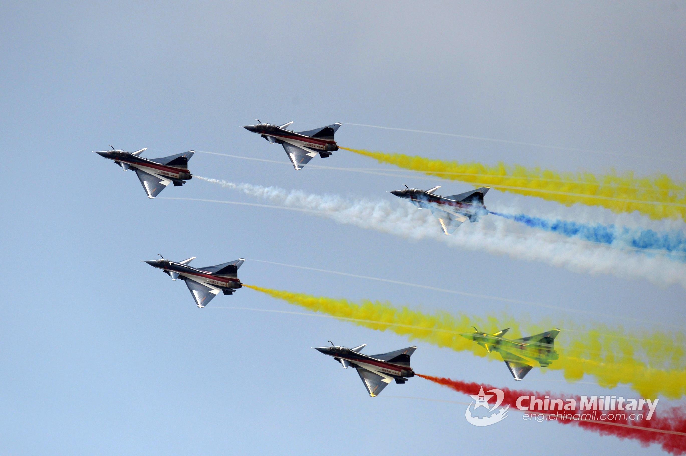 J-10 fighter jets attached to the PLA Air Force's Bayi Aerobatics Team perform aerobatic stunts during a six-day airshow in Zhuhai, South China's Guangdong Province, on Sept. 29, 2021. The 13th China International Aviation and Aerospace Exhibition, or Airshow China 2021, was held from September 28 to October 3, 2021. (eng.chinamil.com.cn/Photo by Yu Hongchun)
