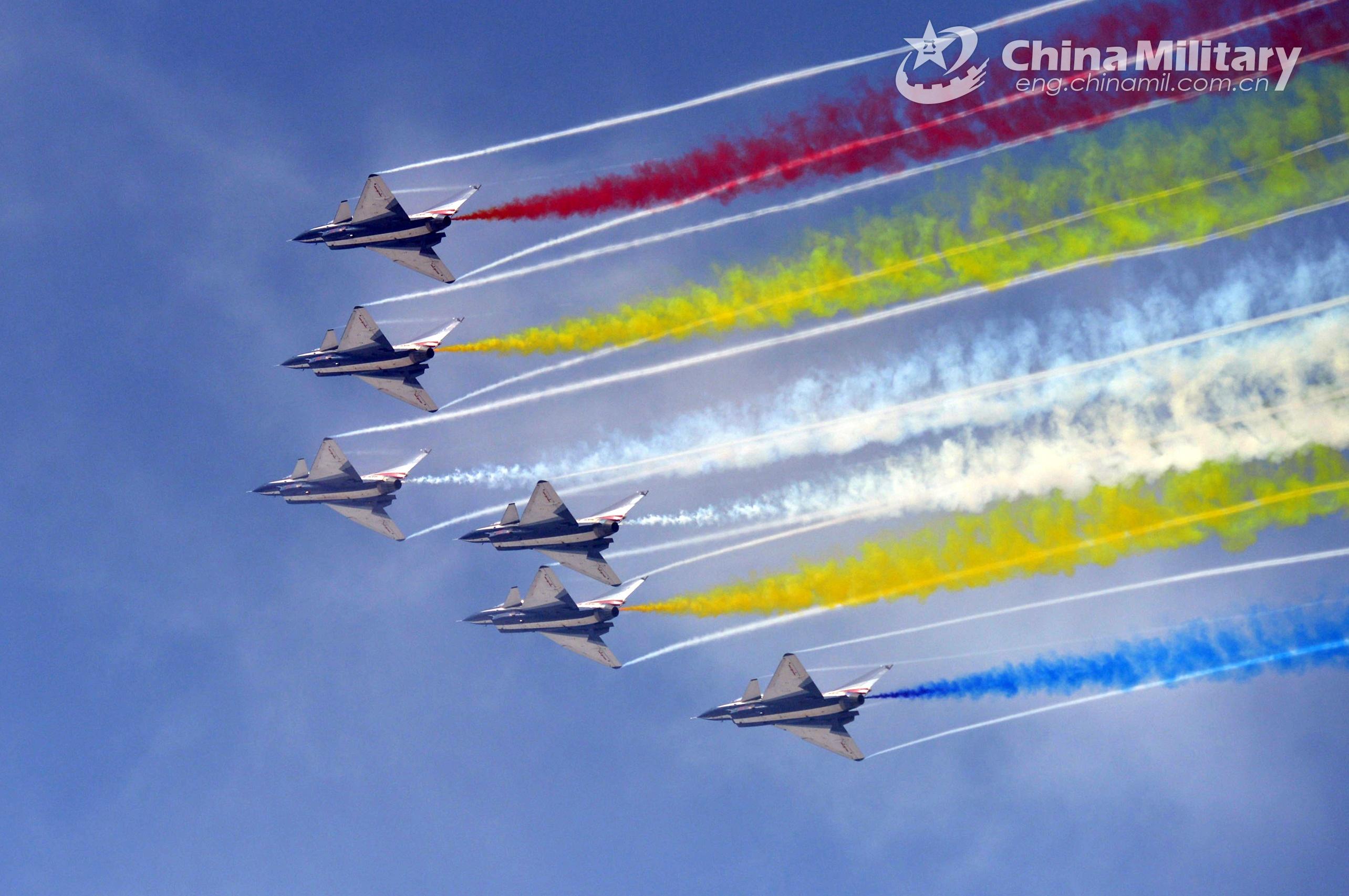 J-10 fighter jets attached to the PLA Air Force's Bayi Aerobatics Team perform aerobatic stunts during a six-day airshow in Zhuhai, South China's Guangdong Province, on Sept. 29, 2021. The 13th China International Aviation and Aerospace Exhibition, or Airshow China 2021, was held from September 28 to October 3, 2021. (eng.chinamil.com.cn/Photo by Yu Hongchun)