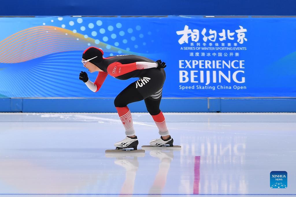 Yang Binyu of China competes during the Experience Beijing Speed Skating China Open Women's 3000m in Beijing, China on Oct. 8, 2021. (Xinhua/Chen Yichen)