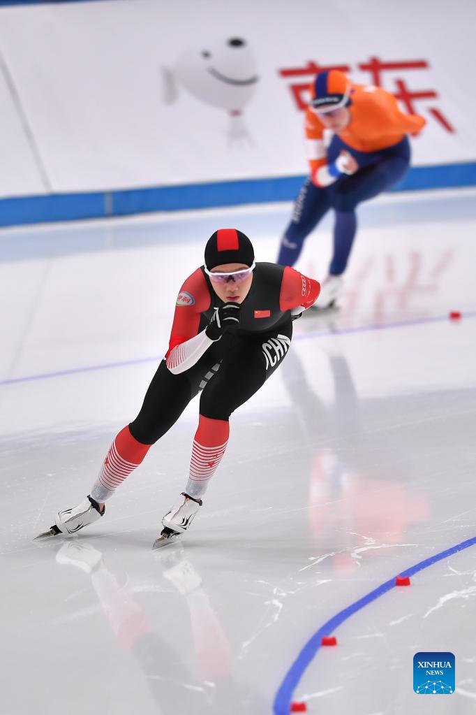 Yang Binyu (front) of China competes during the Experience Beijing Speed Skating China Open Women's 3000m in Beijing, China on Oct. 8, 2021. (Xinhua/Chen Yichen)