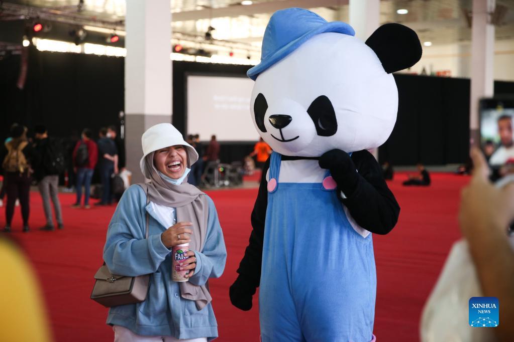 A visitor poses for photo at the Made in Asia animation and cartoon products fair in Brussels, Belgium, Oct. 8, 2021. (Xinhua/Zheng Huansong)