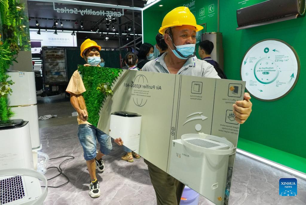 Staff members lay out exhibits at the exhibition center that is going to host the 130th session of the China Import and Export Fair in Guangzhou, south China's Guangdong Province, Oct. 9, 2021. The fair is slated to open here on Oct. 15. (Xinhua/Liu Dawei)