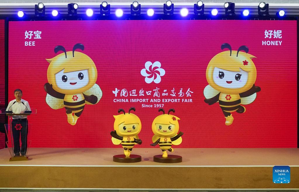 Photo taken on Oct. 9, 2021 shows "Bee" and "Honey", mascots of the 130th session of the China Import and Export Fair, during a press conference in south China's Guangdong Province. The 130th session of the China Import and Export Fair, which will kick off on Oct. 15, 2021, unveiled its mascots "Bee" and "Honey" on Saturday. (Xinhua/Liu Dawei)