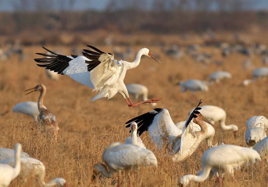 White cranes forage in a farmland by the Poyang Lake in Yugan County, east China's Jiangxi Province, Jan. 15, 2021. (Xinhua/Peng Zhaozhi)
