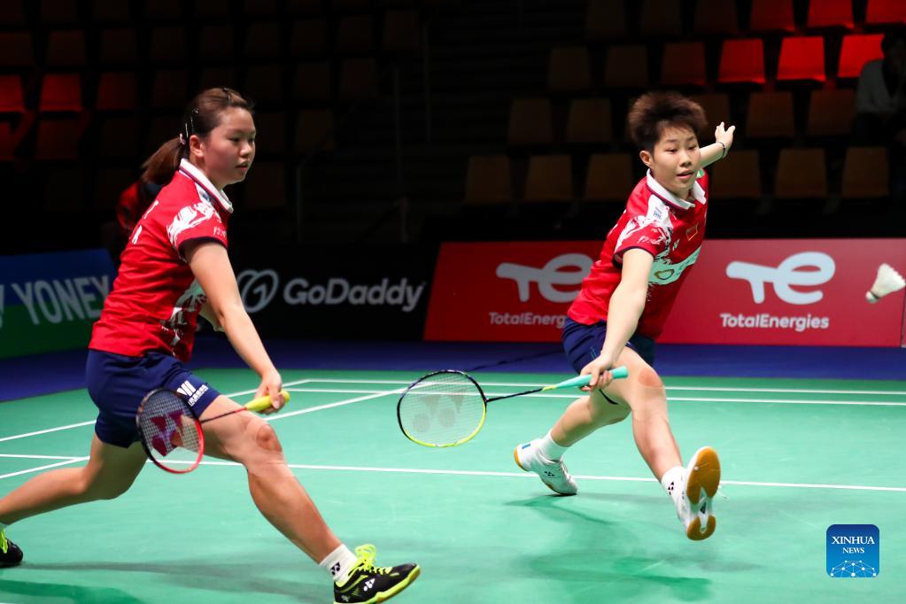 China's Liu Xuanxuan (R) /Xia Yuting compete in the women's doubles match against Malaysia's Lee Meng Yean/Muralitharan Thinaah during the group D match between China and Malaysia at Uber Cup badminton tournament in Aarhus, Denmark, Oct. 10, 2021. (Xinhua/Zhang Cheng)