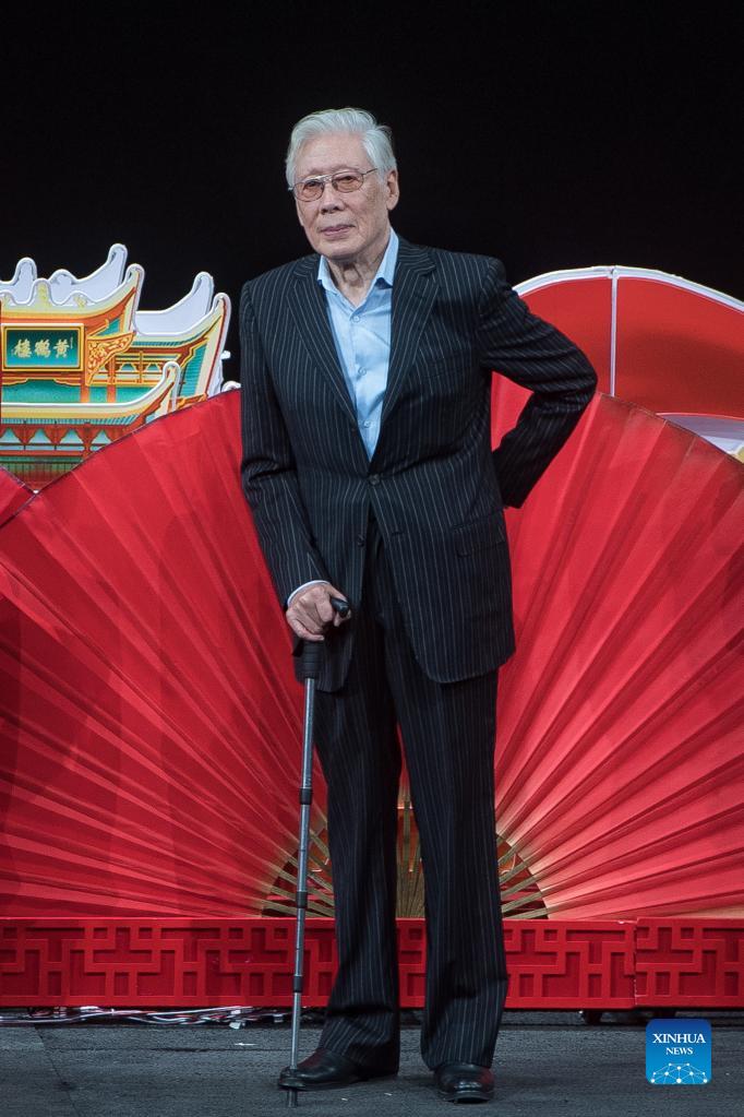 Chinese actor Jiao Huang receives lifetime achievement award from the China Federation of Literacy and Art Circles, at the opening ceremony of the 17th China Theater Festival in Wuhan, central China's Hubei Province, Oct. 9, 2021. The 17th China Theater Festival, a national theater and performing arts event, opened on Saturday in Wuhan. Altogether 31 plays of various genres from across the country, including Peking Opera and Kunqu Opera, are scheduled to be performed at the festival that runs through Oct. 28. (Xinhua/Xiao Yijiu)
