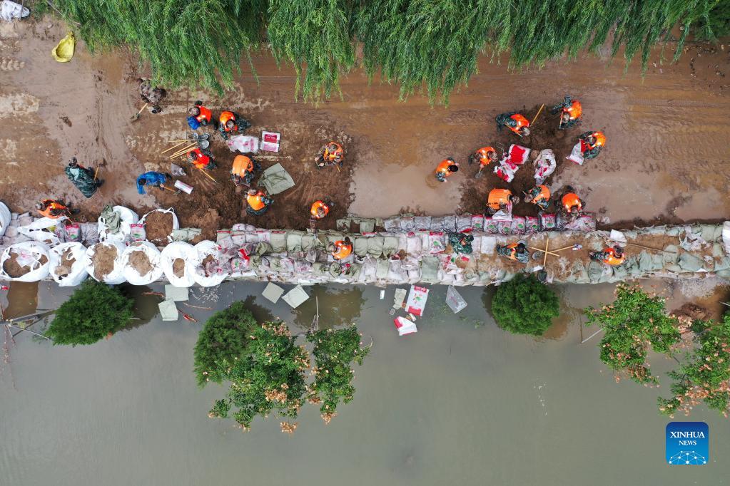 Aerial photo shows rescuers fortifying temporary dyke against the flood at Lianbo Village in Hejin City, north China's Shanxi Province, Oct. 10, 2021. More than 120,000 people have been temporarily evacuated after continuous downpours triggered floods in north China's Shanxi Province, authorities said Sunday. The floods have disrupted the lives of 1.76 million residents from 76 counties, cities and districts, according to the provincial department of emergency management. Some 190,000 hectares of crops were damaged and more than 17,000 houses collapsed, the department said. Emergency management departments of various levels have allocated 4,000 tents, 3,200 folding beds as well as cotton clothes and quilts for disaster relief. (Xinhua/Zhan Yan)