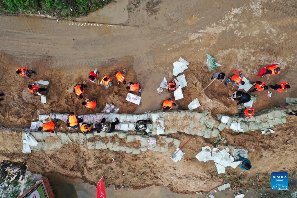 Aerial photo shows rescuers fortifying temporary dyke against the flood at Lianbo Village in Hejin City, north China's Shanxi Province, Oct. 10, 2021. More than 120,000 people have been temporarily evacuated after continuous downpours triggered floods in north China's Shanxi Province, authorities said Sunday. The floods have disrupted the lives of 1.76 million residents from 76 counties, cities and districts, according to the provincial department of emergency management. Some 190,000 hectares of crops were damaged and more than 17,000 houses collapsed, the department said. Emergency management departments of various levels have allocated 4,000 tents, 3,200 folding beds as well as cotton clothes and quilts for disaster relief. (Xinhua/Zhan Yan)