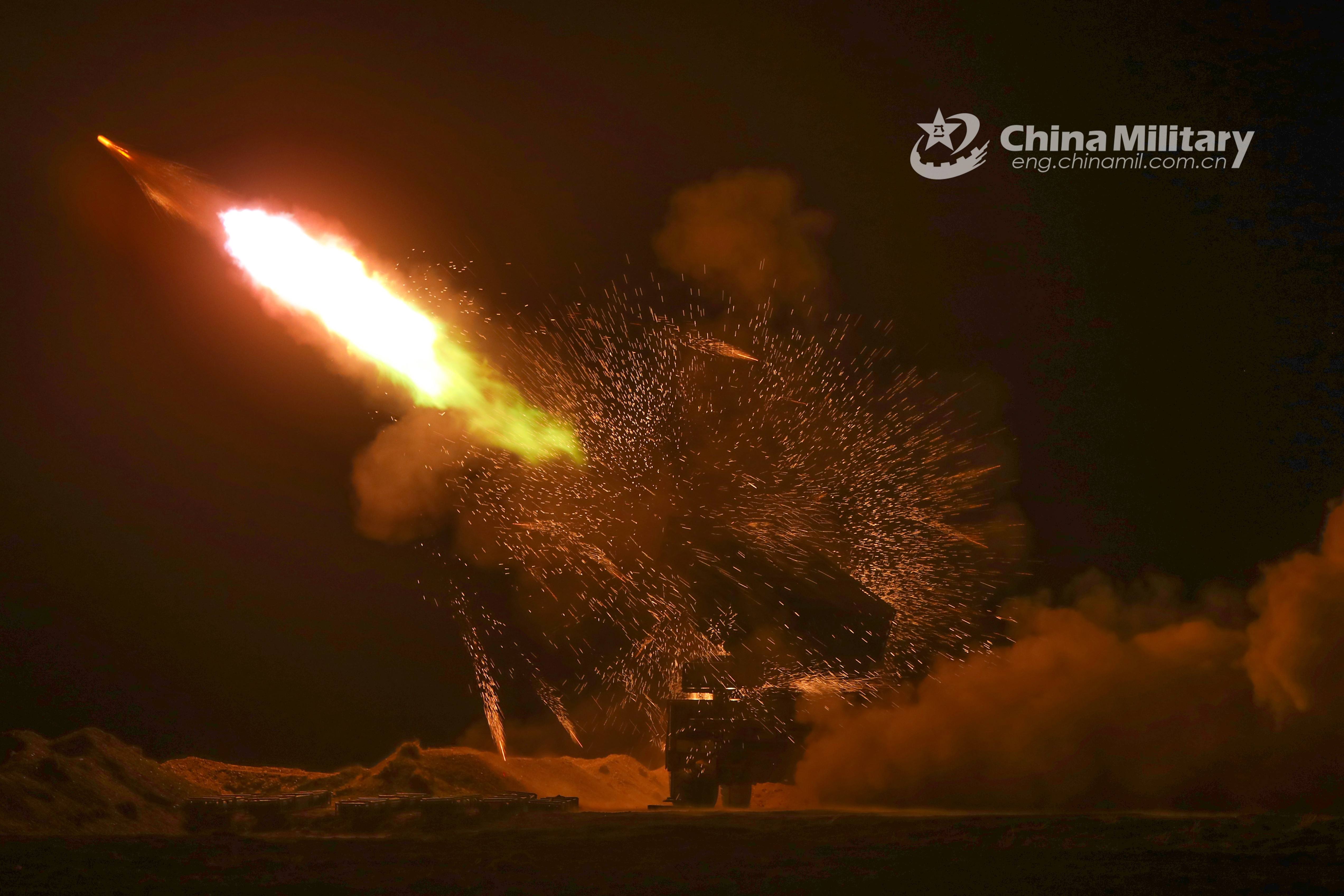 A vehicle-mounted rocket launcher attached to an artillery contingent of a regiment under the PLA Xinjiang Military Command fires at mock targets during a round-the-clock live-fire training exercise on September 30, 2021. (eng.chinamil.com.cn/Photo by Huang Feihao)