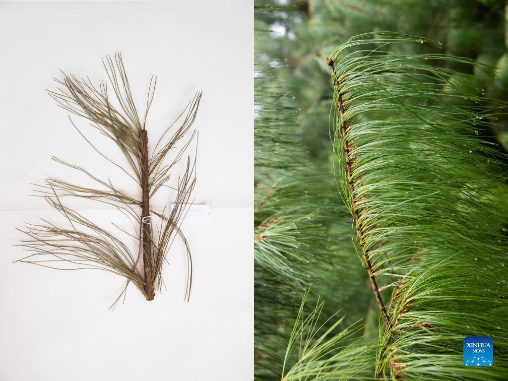 Combo photo taken on Oct. 10, 2021 shows a sample of Pinus squamata, or the Qiaojia pine, collected by researchers in the wild (L) and a transplanted Qiaojia pine growing in the Kunming Botanical Garden in Kunming, southwest China's Yunnan Province. Kunming Botanical Garden has built a garden featuring Plant Species with Extremely Small Populations (PSESP) since 2015. Currently, a total of 44 rare target species have been transplanted into the garden under protection efforts. (Xinhua/Jin Liwang)
