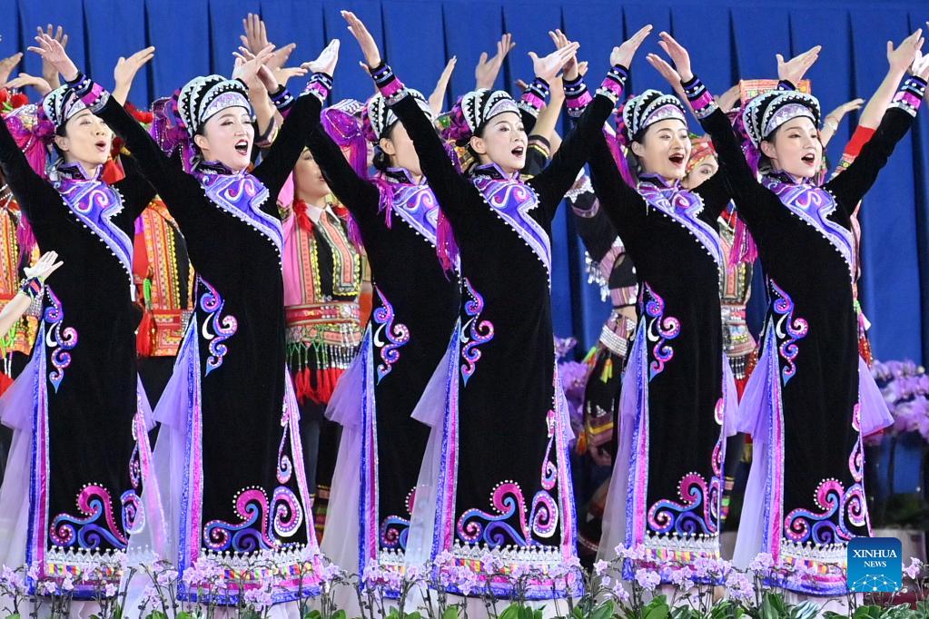 Folk artists perform during the opening ceremony of the 15th meeting of the Conference of the Parties to the UN Convention on Biological Diversity (COP15) in Kunming, southwest China's Yunnan Province, Oct. 11, 2021. COP15 kicked off in Kunming on Monday. (Xinhua/Yue Yuewei)