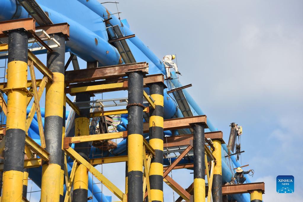 Constructors work at the construction site of Beizitou grand bridge in Huidong County of Huizhou, south China's Guangdong Province, Oct. 11, 2021. As part of the Guangzhou-Shanwei High Speed Railway, the 112-meter bridge finished its tied-arch closure on Monday. (Xinhua/Liu Dawei)