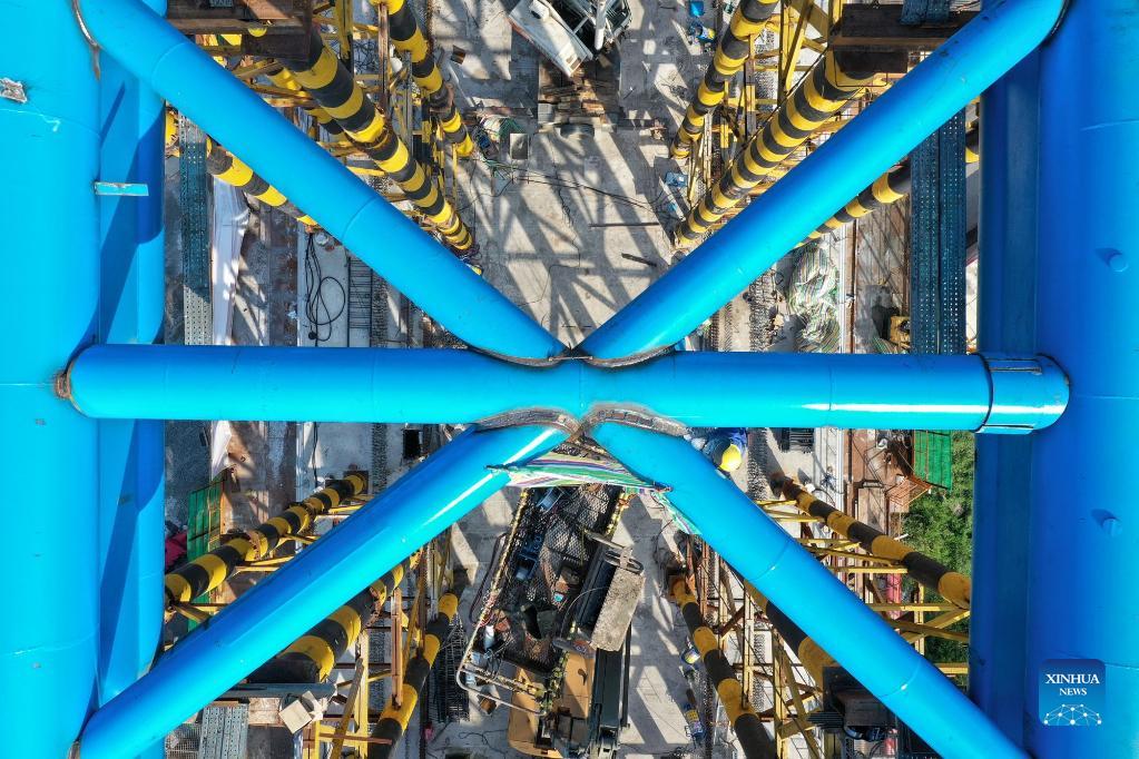 Aerial photo shows constructors working at the construction site of Beizitou grand bridge in Huidong County of Huizhou, south China's Guangdong Province, Oct. 11, 2021. As part of the Guangzhou-Shanwei High Speed Railway, the 112-meter bridge finished its tied-arch closure on Monday. (Xinhua/Liu Dawei)