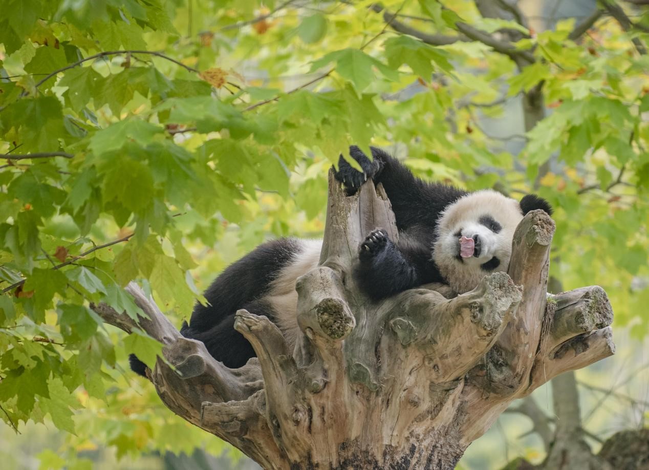 A giant panda is playing on a tree at the Shenshuping base of China Conservation and Research Centre for the Giant Panda in Wenchuan county, Aba Tibetan and Qiang autonomous prefecture, southwest China's Sichuan province, Oct. 3, 2021. (People's Daily Online/Liu Guoxing)