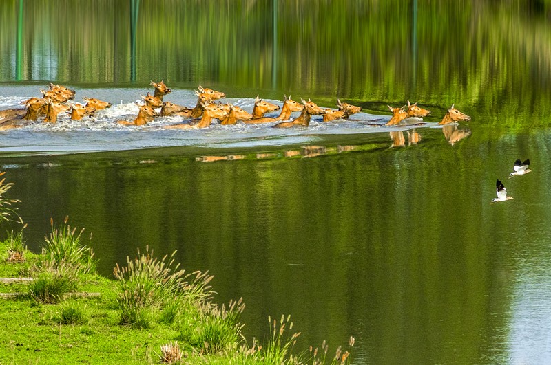 Elks swim in a river in the Qinhu Lake National Wetland Park, Jiangyan district, Taizhou, east China's Jiangsu province, Sept. 8, 2021. (People's Daily Online/Gu Jihong)