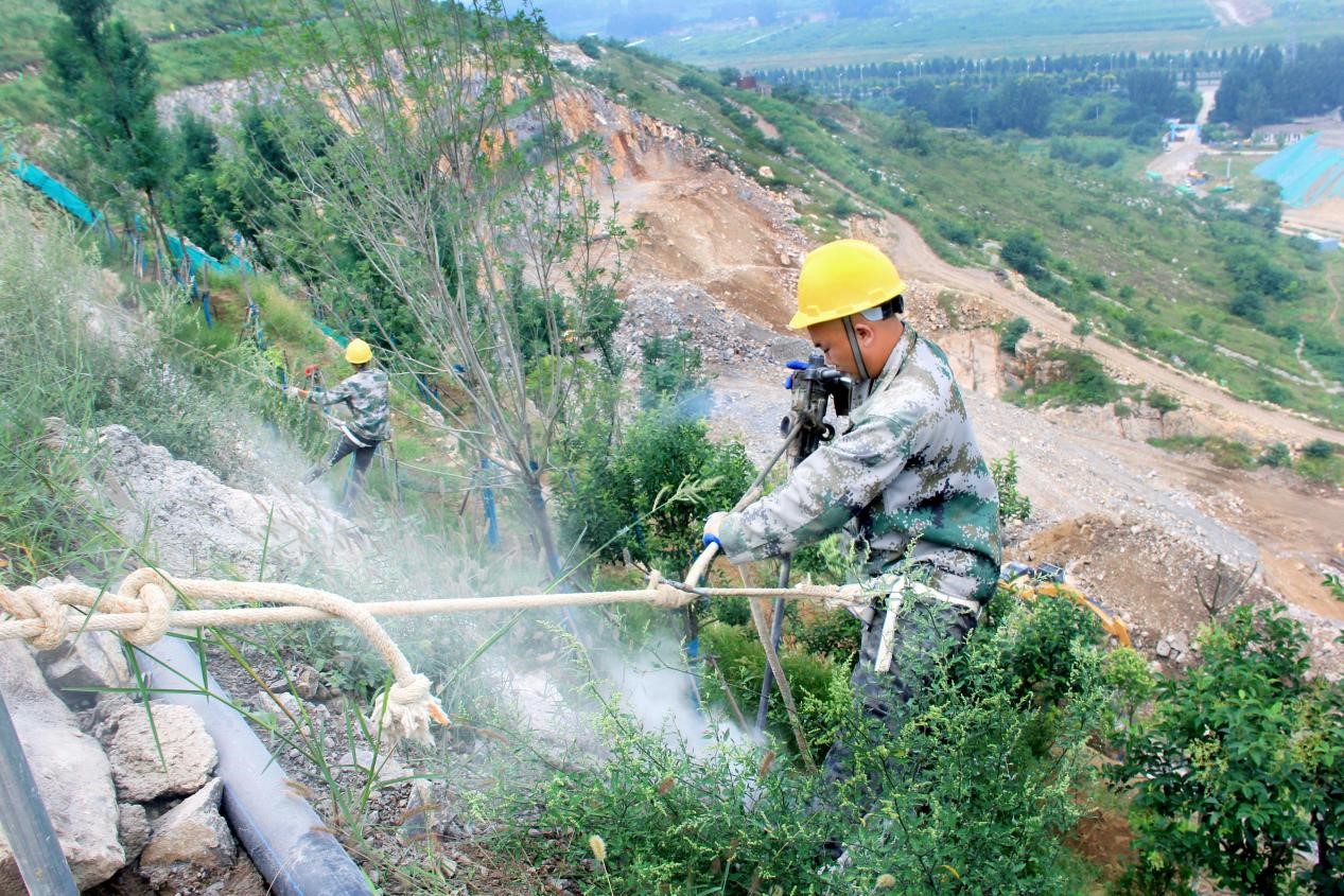 Workers plant trees for a mine crater ecological restoration project in Quanshan Mountain, Huaibei, east China's Anhui province, Sept. 7, 2021. (People's Daily Online/Zhou Fangling)