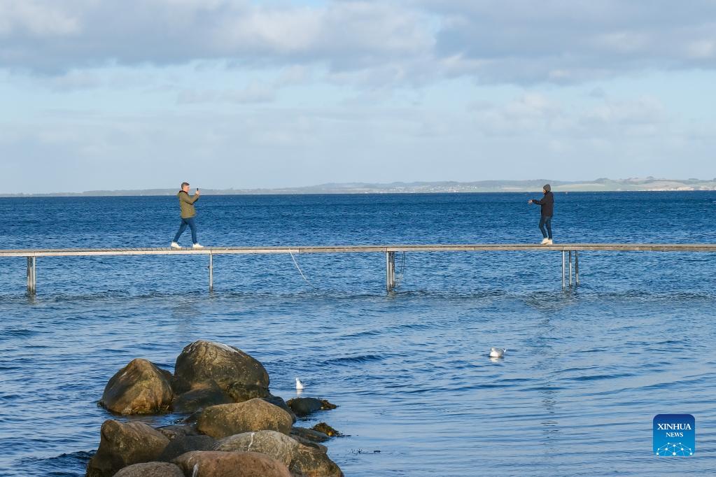 People walk on "The Infinite Bridge" in Aarhus, Denmark, Oct. 11, 2021. The Infinite Bridge is a sculpture by Danish architect studio Gjode &Povlsgaard Arkitekter built at the beach in Aarhus. It has a diameter of 60 meters and is positioned half on the beach and half in the sea. (Xinhua/Zhang Cheng)