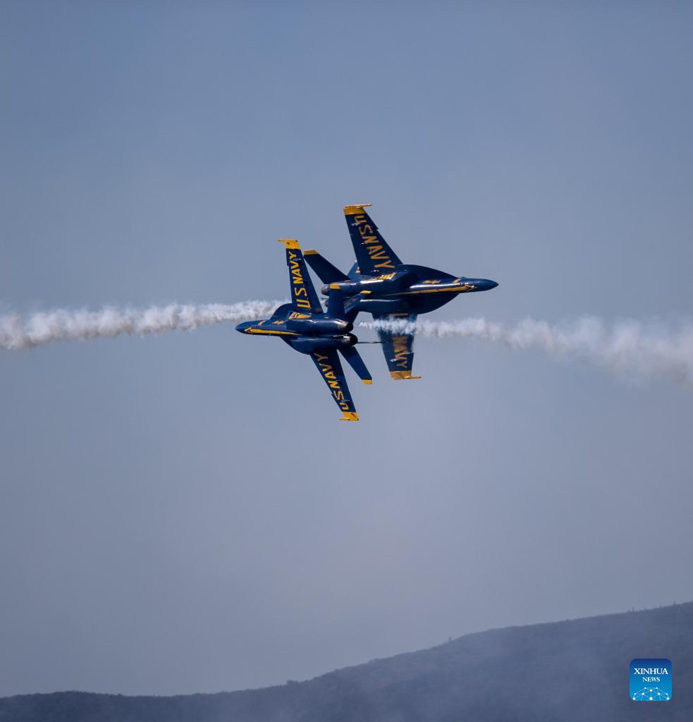 U.S. Navy aerobatics team Blue Angels perform during an air show of the annual Fleet Week activities in San Francisco, the United States, Oct. 10, 2021. (Photo by Dong Xudong/Xinhua)