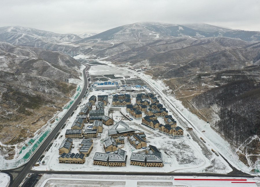 Aerial photo taken on Feb. 28, 2021 shows the snow covered athletes' village in Zhangjiakou competition zone of the 2022 Beijing Winter Olympic Games in Zhangjiakou, north China's Hebei province. (Photo by Wu Diansen/Xinhua)