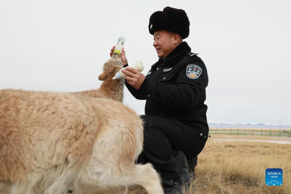 Zhao Xinlu, director of the Sonam Dargye Protection Station, feeds a baby Tibetan antelope with milk at a wildlife rescue center of Sonam Dargye Protection Station in Hoh Xil, northwest China's Qinghai Province, Dec. 7, 2020. The Hoh Xil National Nature Reserve is home to various wild animals. In 2002, the Sonam Dargye Protection Station in Hoh Xil founded a wildlife rescue center in an effort to strengthen the protection of wild animals. Since its foundation, the center has saved, fed and medically treated more than 600 wild animals including over 50 Tibetan antelopes. Tibetan antelopes are mostly found in the Tibet Autonomous Region, Qinghai Province and the Xinjiang Uygur Autonomous Region. The species is under first-class state protection in China. Working as "babysitters" at an altitude of over 4,400 meters, patrollers of Hoh Xil shoulder the responsibility of rescuing and taking care of baby Tibetan antelopes. (Xinhua/Wang Yan)
