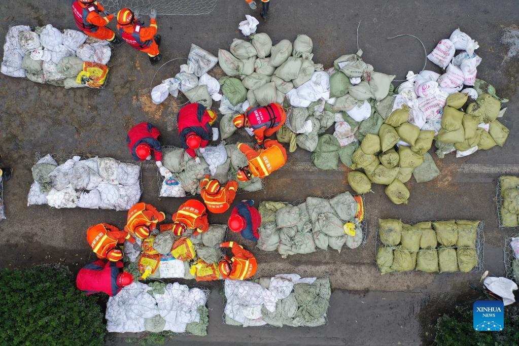 Aerial photo taken on Oct. 11, 2021 shows rescuers reinforcing dyke of the Fenhe River, a tributary of the Yellow River, in Jishan County, north China's Shanxi Province. A dyke crack with a length of more than 10 meters was closed in a section of the Fenhe River in Jishan on Monday. (Xinhua/Zhan Yan)